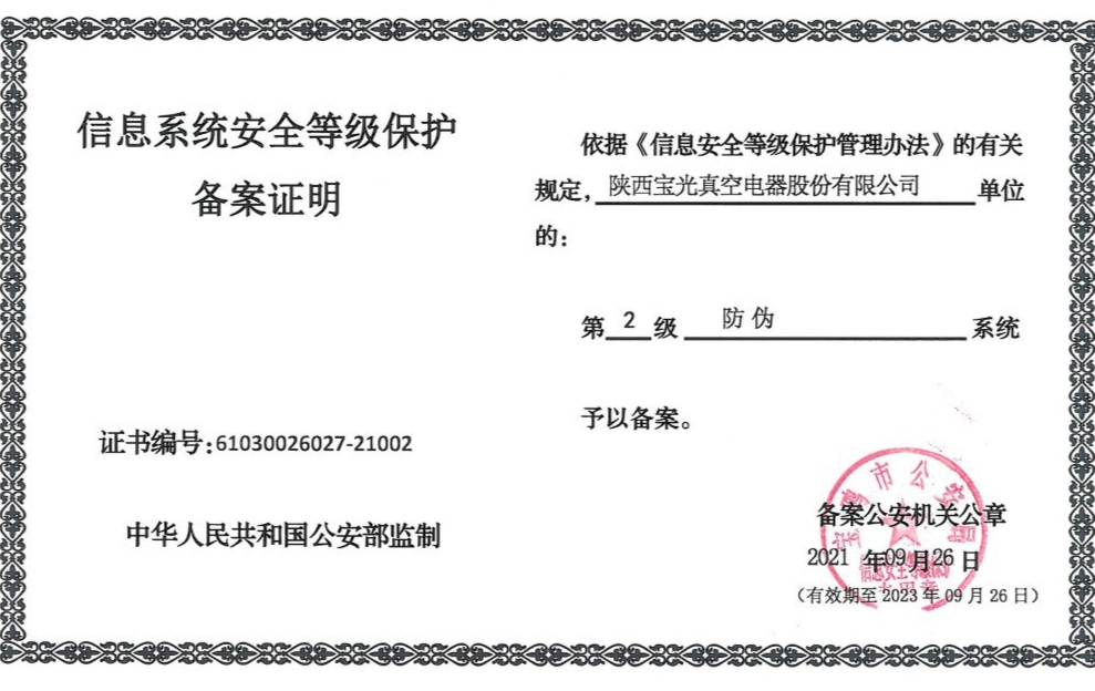 寶光股份順利取得關(guān)鍵信息系統(tǒng)“等保”備案證明