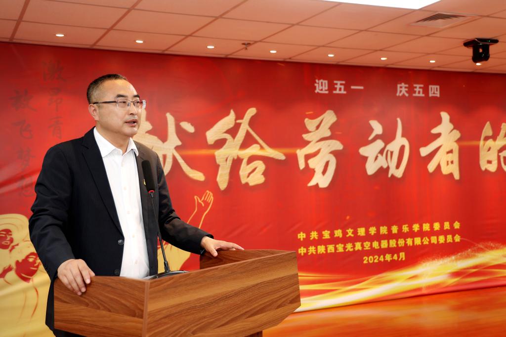 為深入學(xué)習宣傳貫徹習近平新時代中國特色社會主義思想和黨的二十大精神,切實營造尊重勞動、關(guān)愛青年的濃厚氛圍,在“五一”勞動節(jié)、“五四”青年節(jié)來臨之際,公司黨委與寶雞文理學(xué)院音樂學(xué)院黨委聯(lián)合開展“弘揚勞動精神 傳承工匠文化”道德講堂,為廣大干部職工送上了一場精彩紛呈的文化大餐。寶雞文理學(xué)院音樂學(xué)院黨委書記黃瑋、寶光股份黨委書記、董事長謝洪濤出席活動并致詞。
