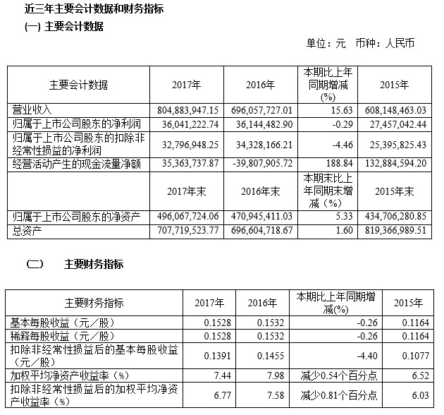 寶光股份2017年度主要財務指標